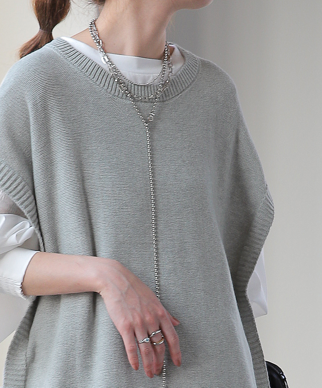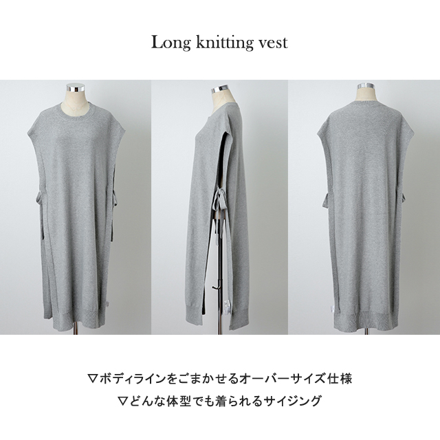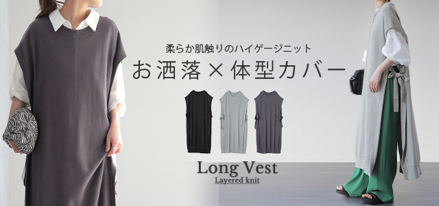 シンプルなコーデも華やかな印象になるロングニットベストです。