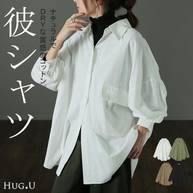 抜け感可愛い。『 彼シャツ 』 体型カバー 綿100% シャツ トップス レディース チュニック リネン風 長袖 ゆる ビッグサイズ 大きいサイズ ドルマン ロングシャツ ロング ブラウス 羽織 白シャツ オーバーサイズ 白 ブラック カーデ HUG.U 夏 秋新作