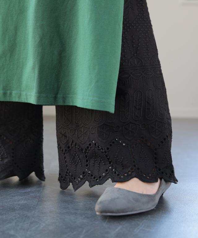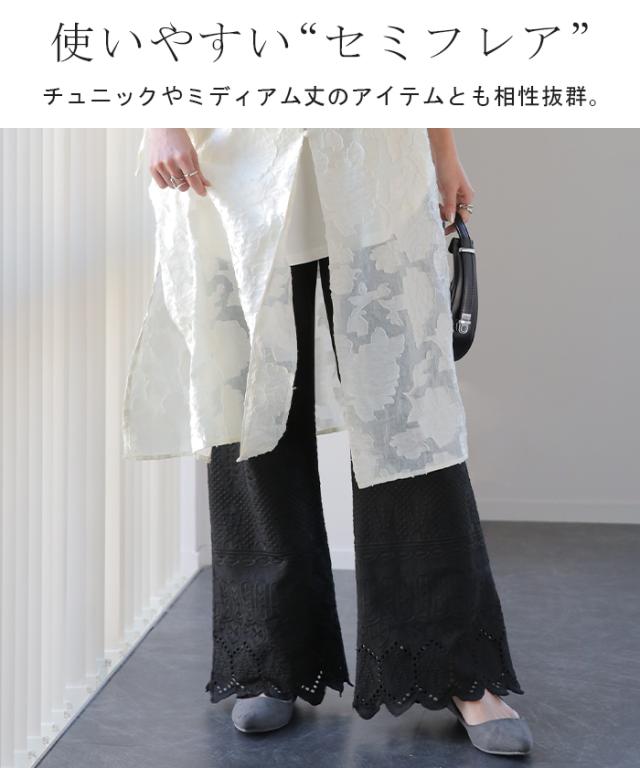 チュニックに合わせる「 セミフレア 」 ペチパンツ 裾パンツ レディース パンツ 綿 100% ペチコート ボトムス レイヤード セミフレアパンツ レース ズボン ロング 体型カバー ゴム ワイド 刺? 黒 緑 大きいサイズ 冬 秋 ワイドパンツ HUG.U 秋新作