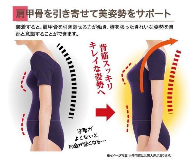 背筋をシャキッと伸ばして見た目の印象アップ。 肩甲骨を引き寄せて美姿勢をサポート。