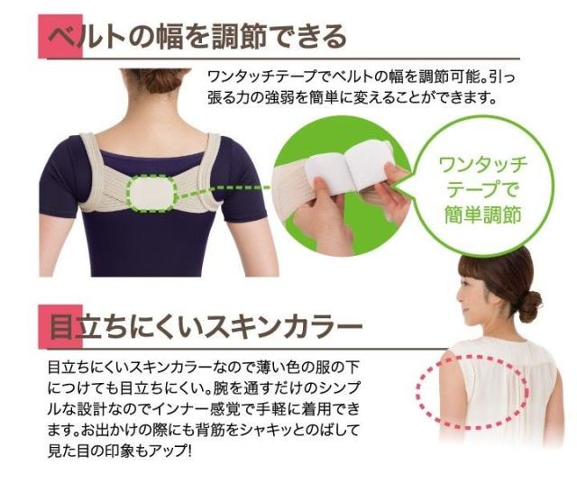 | ご使用方法 | 1.体のサイズに合わせて、中央のワンタッチテープを止めてください。 2.箱正面図の写真のように装着してください。肌を傷つけるおそれがありますのでワンタッチテープの凸部が肌に当たらないようにしてください。肩が締まり過ぎないようにご注意ください。 ※ご使用時はベルトの幅を調節して、程よい引っ張り感になるように調節してください。ワンタッチテープでお好みの幅(肩幅約35 〜45cmに対応)に調節することができます。尚、ワンタッチテープは3cm以上重なるようにしてください。 |