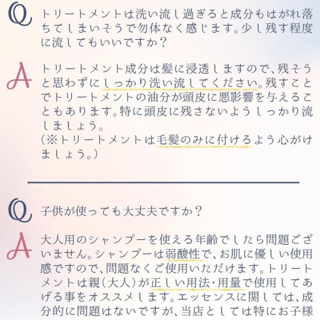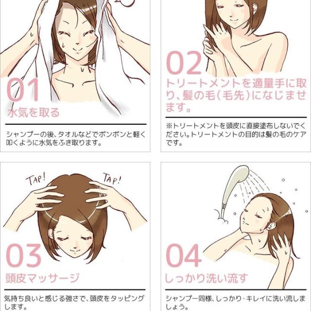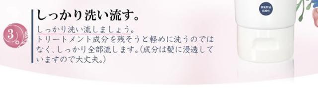 | ご使用方法 | シャンプー後、水気を軽くきってから適量を手に取り、髪全体になじませた後、洗い流してください。 |