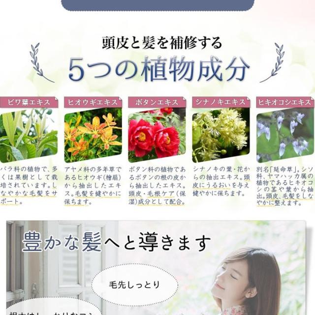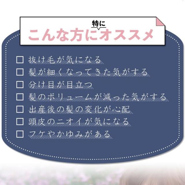 | 使用上の注意 | ●使用中や使用後に頭皮に刺激等の異常が現れた時は、使用を中止し、皮膚科専門医等へご相談されることをおすすめします。 ●頭皮に傷、はれもの、湿疹等異常のある場合はご使用にならないでください。 ●目に入ったときは、直ちに洗い流してください。 ●乳幼児の手の届かないところに保管してください。 ●極端に高温または低温の場所、直射日光のあたる場所には保管しないでください。 ●天然由来成分を配合しておりますので、変色する場合がありますが品質には問題ございません。 |