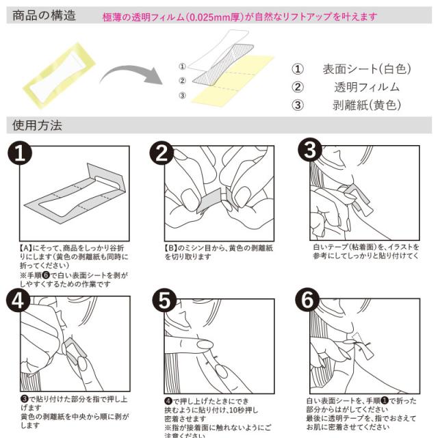 | 使用上のご注意 | ・洗顔後、お肌がきれいな状態でフィルムをご使用ください。 ・皮脂やファンデーション等の汚れた状態でご使用いただくと剥がれやすくなってしまう恐れがあります。 ・傷やはれものなどお肌に異常がある場合はご使用をおやめください。 ・ムダ毛の処理を行わず本品を使用すると剥がす際に痛みを伴う場合がございます。 ・フィルムを剥がす際はできるだけゆっくりと剥がしてください。 ・お肌の弱い方、アレルギー体質の方、絆創膏など、テープ類でかぶれやすい方はご使用にならないでください。 ・本品の使用によりお肌にかゆみ、発疹などの異常があらわれた場合は使用を中止し、専門医にご相談ください。 ・皮膚の弱い方は同じところに繰り返し貼らず少しずらして貼ってください。 ・極端に高温又は低温な場所、直射日光のあたる場所には保存しないでください。 ・乳幼児の手の届かない場所に保管してください。 ・一度剥がしたフィルムは再度使用しないでください。 ・目の下やまぶたなど、皮膚の薄い部分には使用しないでください。 ・傷やはれもの、かぶれなど肌に異常がある場合はご使用にならないでください。 ・お肌の弱い方、アレルギー体質の方、絆創膏など、テープ類でかぶれやすい方はご使用にならないでください。 ※初めてご使用される前は本品を二の腕の内側に貼り、24時間後剥がして皮膚の常態を確認してください。赤み、はれ、かゆみなどの異常があらわれた場合はご使用しないでください。 |