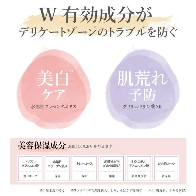 水溶性プラセンタとグリチルリチン酸2Kのw有効成分がデリケートゾーンのトラブルを防ぎます。
