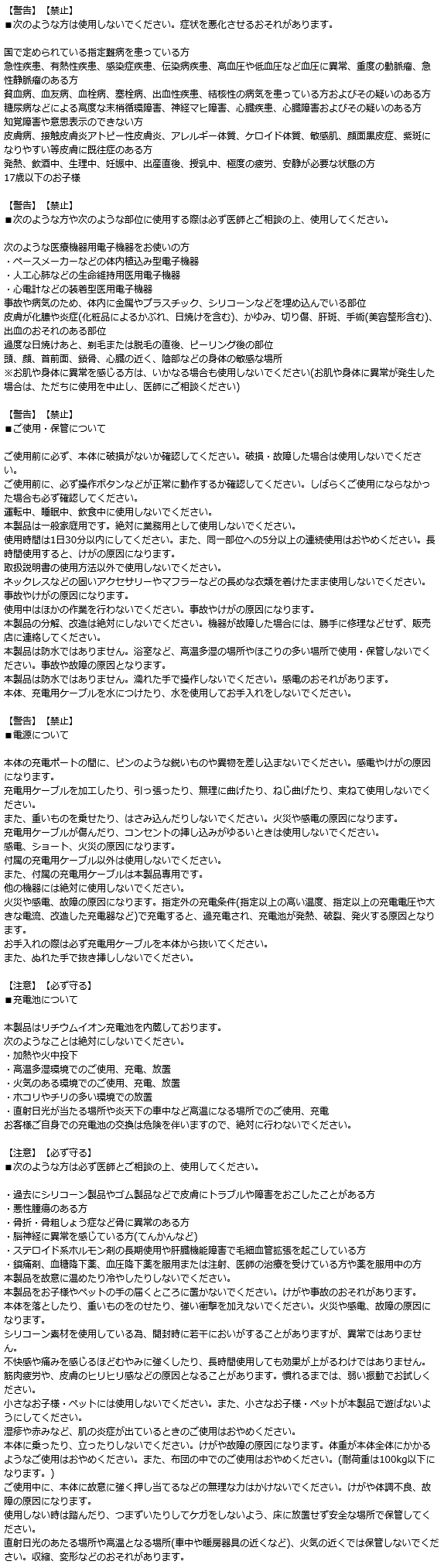 | セット内容 | 本体×1、充電用ケーブル×1、取扱説明書(保証書付き) ※電源アダプターは付属しておりません |