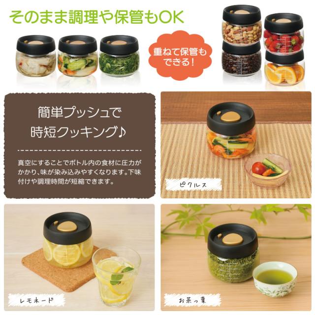 | 商品説明 | 調理と保存を一緒に!押すだけで簡単に空気が真空状態に! ・真空で食材の鮮度キープ!時短調理もできちゃう♪ 真空保存により、食材の鮮度を維持し、乾燥や酸化から守ります。真空にすることでボトル内の食材に圧力がかかり、下味付けの調理時間が短縮され、短時間で食材が味わい深くなります。 ・手軽にマスター!ボタンを押すだけの簡単操作♪ 食材を入れてふたを閉めたあとに真ん中のボタンを15〜20回押すだけ! 小さなボタンを押せば真空解除も簡単にできちゃう。 ・目盛り付きで調理もラクラク♪ 計量カップ不要な目盛り付き!時短レシピで料理のアイディアが広がります。 ・重ねやすく収納に便利♪ そのまま調理はもちろん、重ねて保管もできるので、スペースを取りません。 |