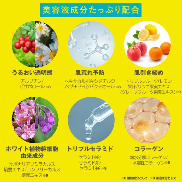 | 成分 | 水、パルミチン酸、TEA、ステアリン酸、イソペンタン、PG、グリチルリチン酸2K、パルミチン酸アスコルビルリン酸3Na、3−ラウリルグリセリルアスコルビン酸、3−O−エチルアスコルビン酸、リンゴ果実培養細胞エキス、コンフリーカルス培養エキス、サポナリアプミラカルス培養エキス、アルブチン、加水分解コラーゲン、グレープフルーツ果実エキス、サンザシエキス、ナツメ果実エキス、リンゴ果実エキス、レモン果汁、グリセリン、ライム果汁、オレンジ果汁、アラントイン、カオリン、バクチオール、ビサボロール、水溶性コラーゲン、ヘキサカルボキシメチルジペプチドー12、ハマメリス葉エキス、キサンタンガム、アーチチョーク葉エキス、水添レシチン、フィトステロールズ、セラミドNP、セラミドNG、セラミドAP、ペンチレングリコール、BG、イソマルト、ラウリン酸ポリグリセリルー10、レシチン、レモン果皮油、オレンジ果皮油、ラバンデュラハイブリダ油、ローマカミツレ花油、ニオイテンジクアオイ油、パルマローザ油、エンピツビャクシン油、セテス—2、イソブタン、ヒドロキシエチルセルロース、PEG−20水添ヒマシ油、硝酸Na、PEG−115M、アセトン、リン酸2Na、グリオキサール、t−ブタノール、フェノキシエタノール |
