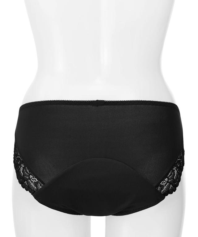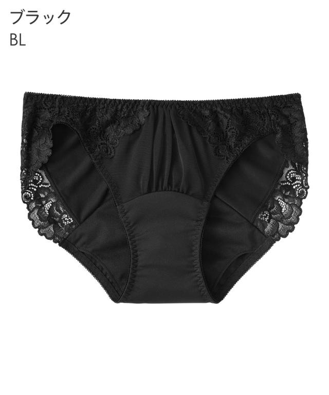 前身頃からサイドにつながるエレガントな花柄レースの大胆な透け感がセクシーなサニタリーショーツです。フロント部分にはチュール生地を重ねて立体感を演出。脚ぐり部分にはストレッチ性の高い幅広レースを使用することで、タイトなスカートやボトムスにもパンティのラインが響きにくくなっています。またマチ部分は防水布を使用したダブルクロッチ仕様で羽つきナプキンにも対応しているから、多い日も安心&快適。お色は万が一の汚れも目立ちにくい、万能カラーのブラックなどをご用意しました。
