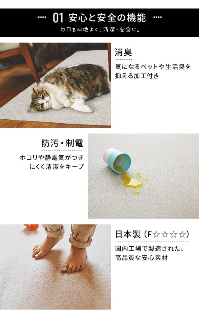 ◆機能:消臭、防汚、遮音、防炎、制電、防ダニ、手洗いOK、遊び毛無し、床暖OK、F☆☆☆☆
