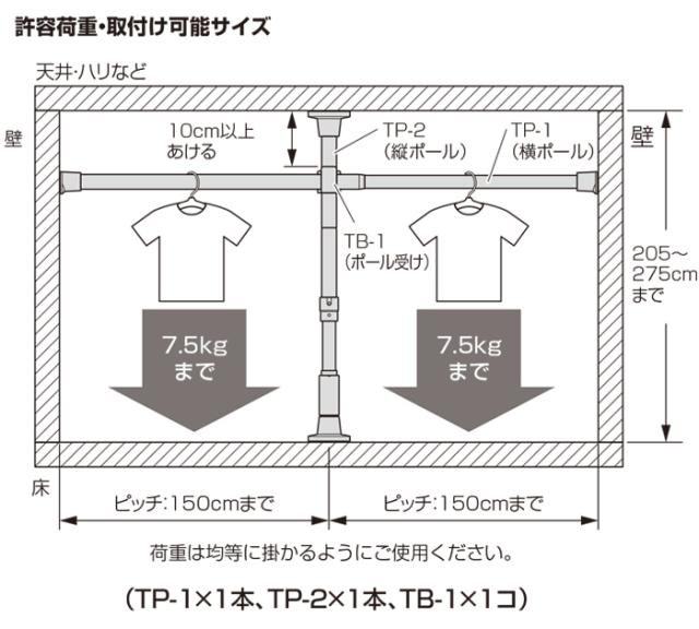 ■耐荷重(目安):横1本あたり7.5kg+7.5kg、合計約15kg 一ヶ所2kgまで