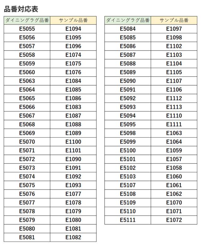 | ※カタログ改定に伴い、品番が変わりました。 サンプルをご希望の方は、下記対応表にて品番をご確認の上、 サンプルページよりご注文をお願いいたします。 |