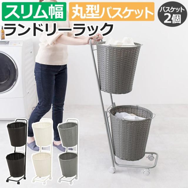 洗濯かご ワゴン ラック かご スリム 収納 おしゃれ ラタン調 ランドリーラック RAN-2431 (H) 約幅36.5×奥行37×高さ109cm ランドリーワゴン 丸型 バスケット2段 キャスター付き 取っ手付き バスケット 取り外し 防水 組立式 シンプル デザイン 省スペース 引っ越し 新生活