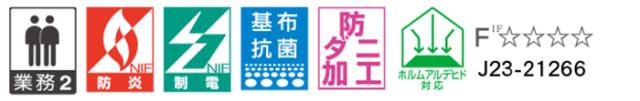 ■機能:防炎(防炎性能試験番号 E2230055)、制電、抗菌、防ダニ加工、F☆☆☆☆(ホルムアルデヒド対応)、業務2
