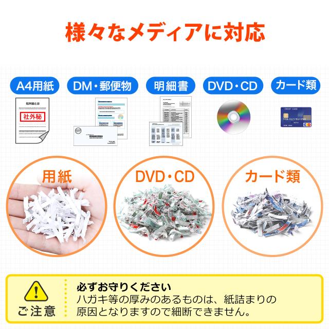 ※ハガキなど厚みのある紙は紙詰まりの原因となるため細断できません。