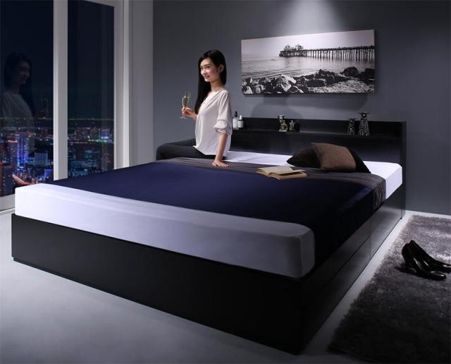 棚・コンセント付収納ベッド 【Milliald】ミリアルド 【マルチラススーパースプリングマットレス付き】 ダブル 【フレーム色】ブラック 【マットレス色】アイボリー