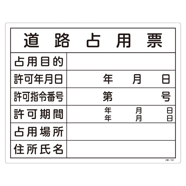工事用標識(許認可標識板) 道路占用票 工事-102 【北海道・沖縄・離島配送不可】