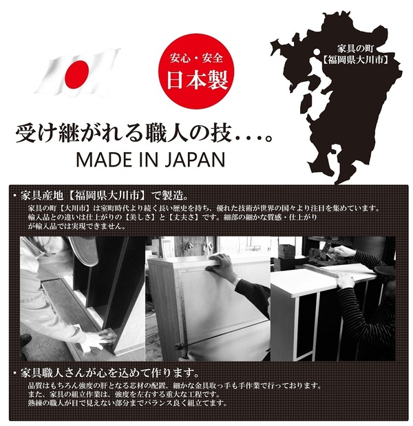 ・通常の宅配便ではなく家具専門の配送業者により九州から出荷するため、お届け先や配送業者の都合により出荷から到着までに1週間程度の日数がかかる場合がございます。