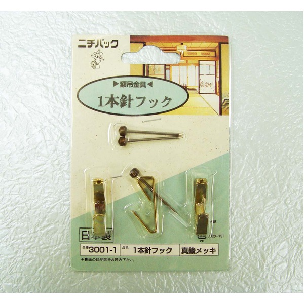 【商品名】 1本針フック3001 【サイズ】 ピンの長さ:23mm(頭除く) 【材質】 鉄 【生産国】 日本製 【特記事項】 5パッケージセット(1パッケージ3個入り)