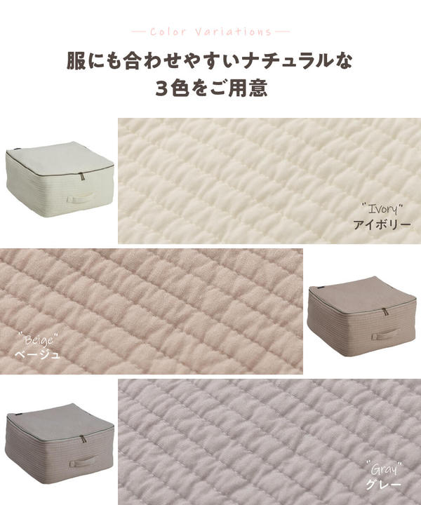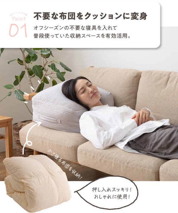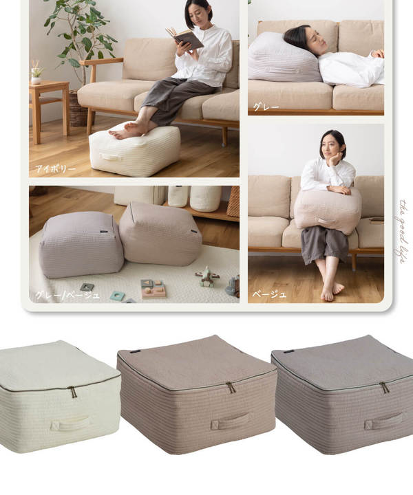イブルの新商品!マルチケース。おふとんや衣類などたくさんつめこんでクッションみたいに使えてインテリアに置いてもおしゃれな収納袋。3カラー展開