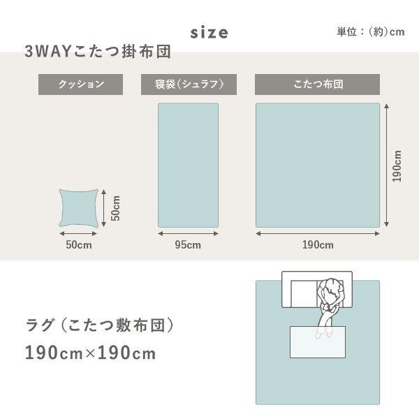 ●本商品は仕入元より配送となるため、北海道・沖縄・離島への配送はできません。 【サイズ(約)】 こたつ布団:190×190cm 寝袋:95×190cm クッション:50×50cm ※こたつ布団・寝袋(シュラフ)・クッションは3WAYで同一商品になります。 【梱包サイズ・重量(約)】 48×60×15cm・2.2kg 【カラー】 グレージュ、ベージュ、ホワイト、ピンク、パープル ※裏地は共通でホワイトです。 【素材】 表生地:ポリエステル100%・ジャガードフランネル 中材:ポリエステル綿 裏面:ポリエステル100%・フランネル 【生産国】 中国 【備考】 洗濯機OK 【商品に関するご注意】 ・本商品は、こたつ布団単品になります。こたつテーブルやこたつ敷き布団は付属しません。 ・ご使用の際はこたつ布団がこたつの中に入らないようにご注意下さい。こたつ布団がヒーターに当たると火災の原因となりま...