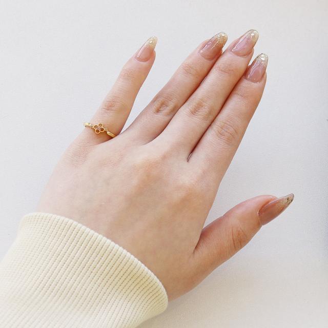フラワーモチーフの地金に天然石をセッティングしたリングは、 華奢ながらかわいいデザインが、 指元でキラキラと輝く華やかな雰囲気にお仕立ていたしました。
