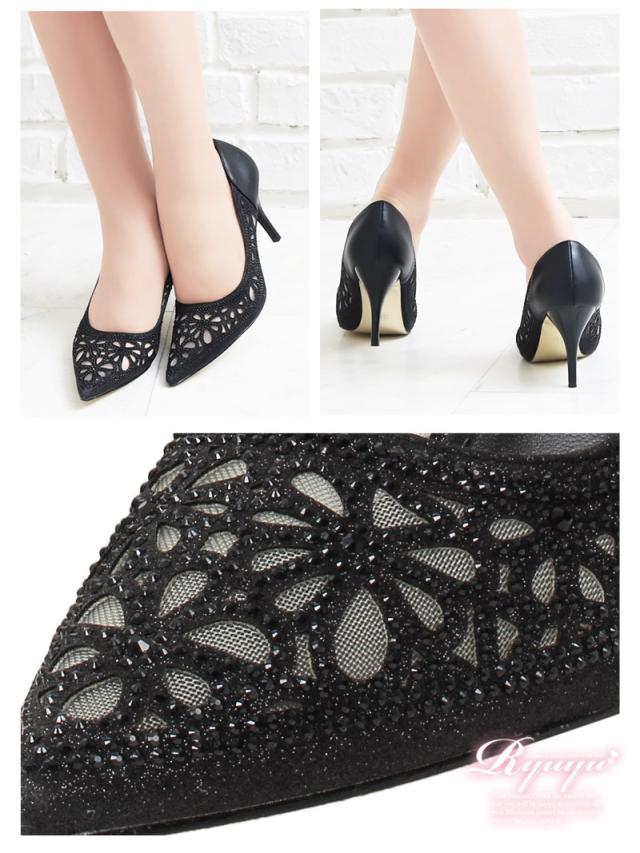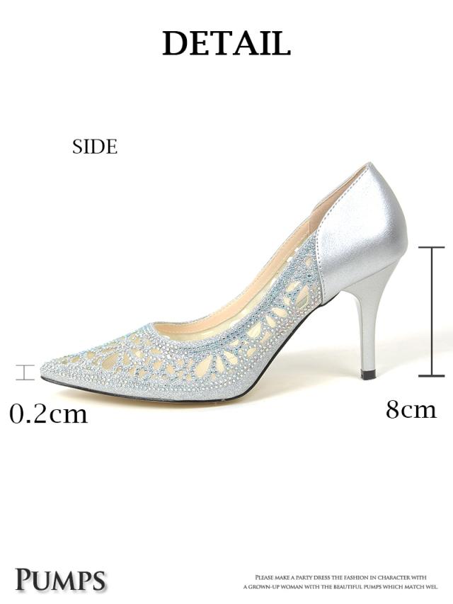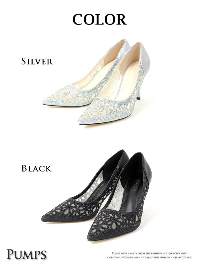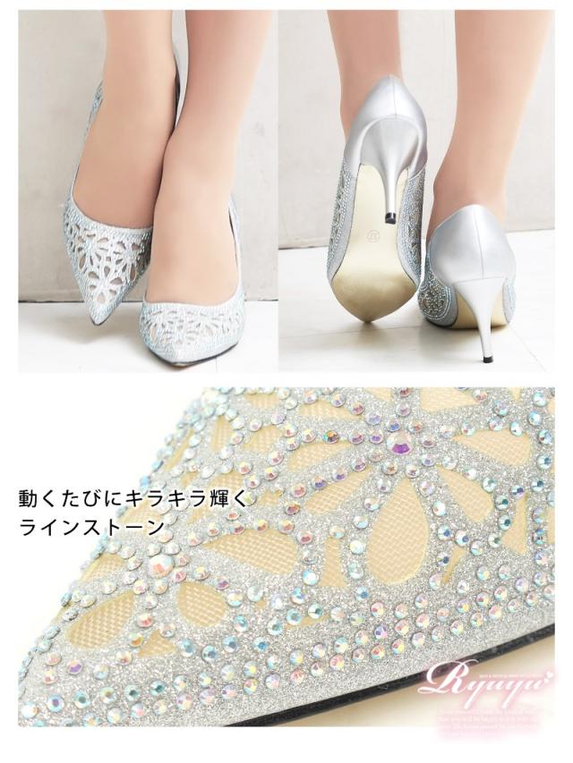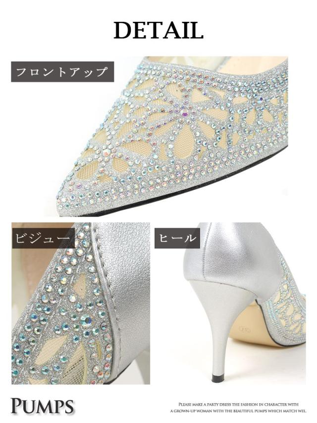 ☆レースのように施されたビジューのポインテッドトゥパンプスは華やかさを演出してくれるキャバパンプス♪