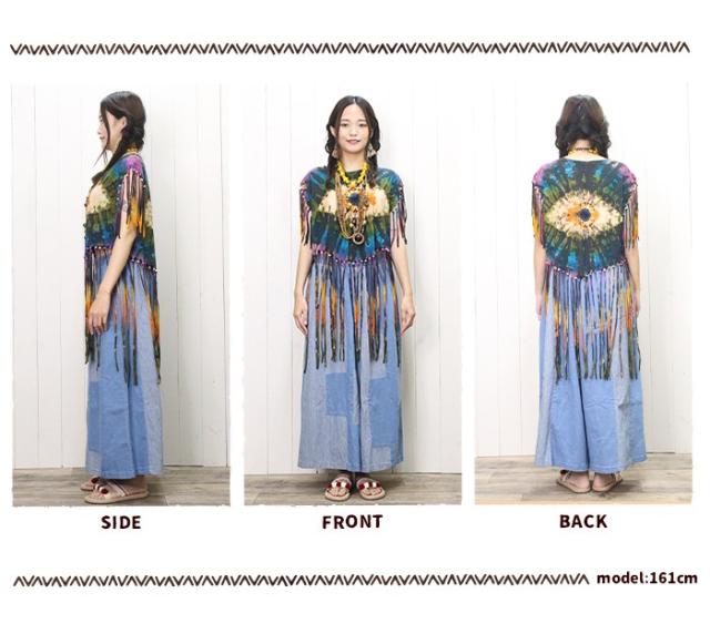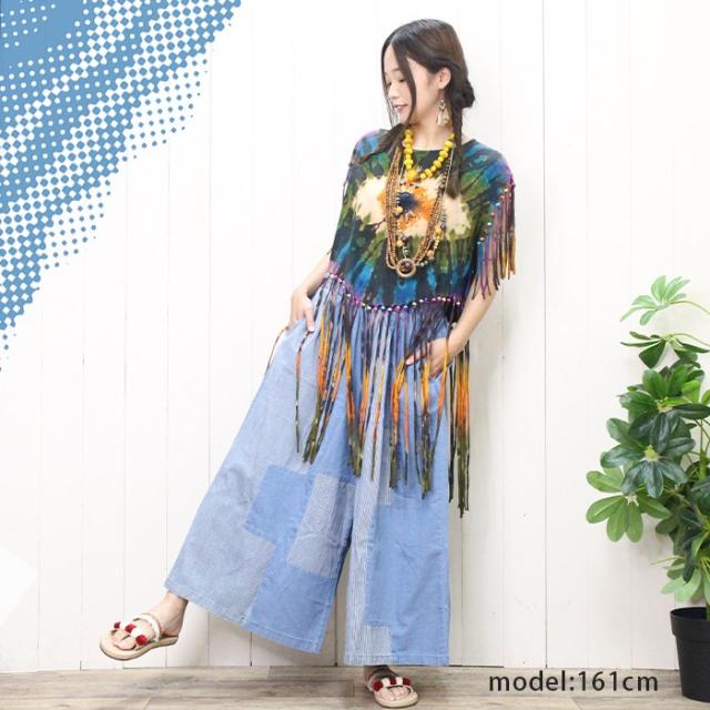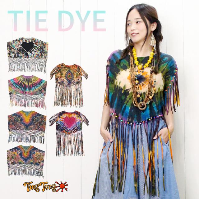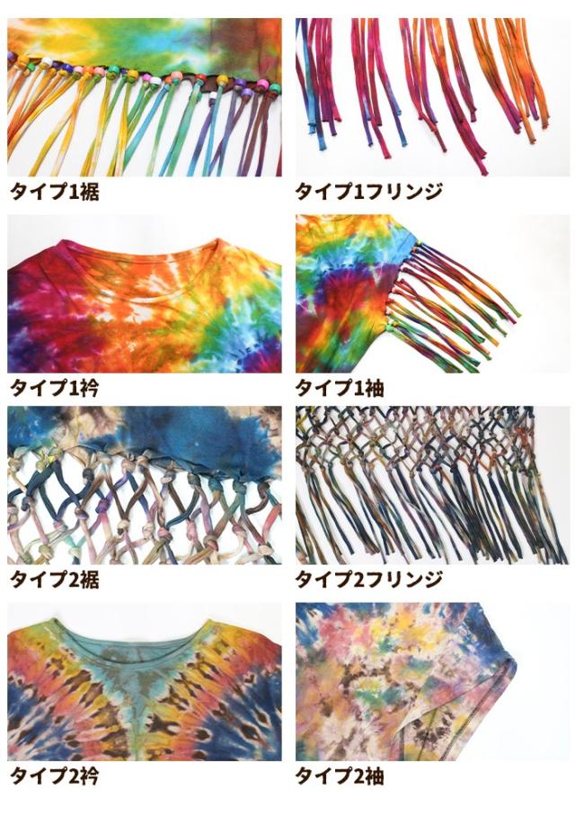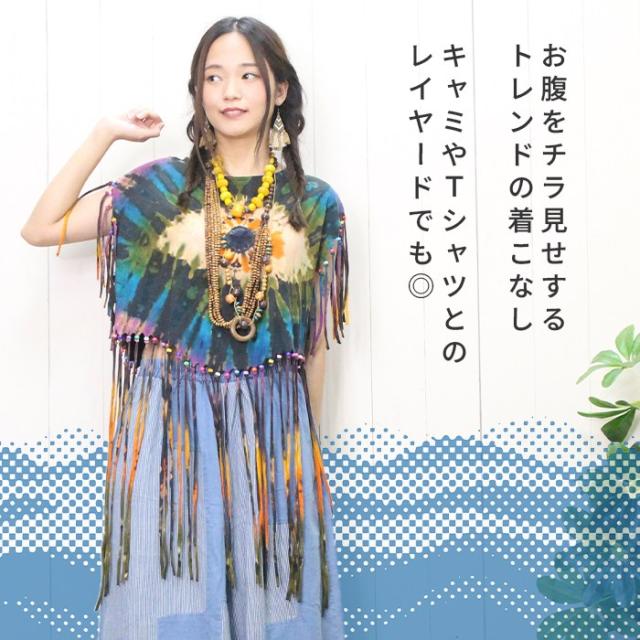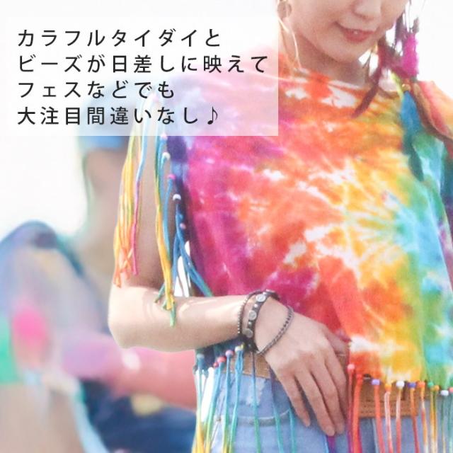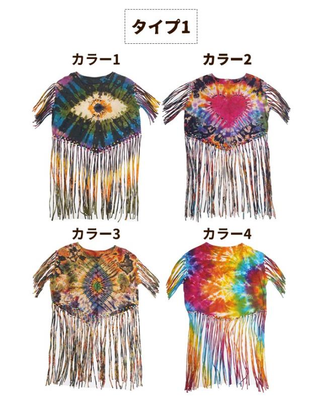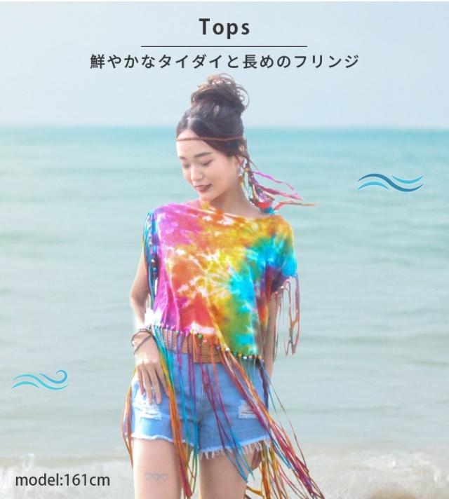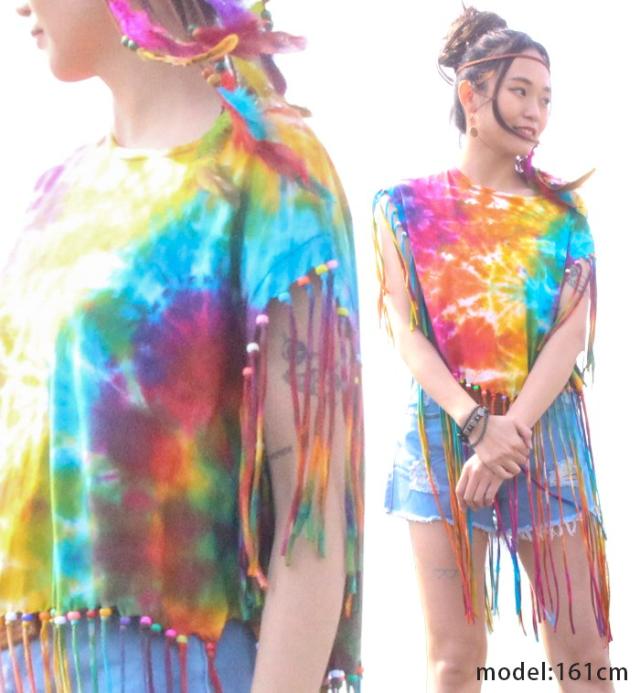 Tシャツ タンク ボヘミアン ボーホー フォークロア !タイダイフリンジヒッピートップス ショート丈 へそ出し フレンチスリーブ 70‘S