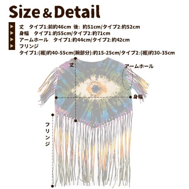 丈 タイプ1:前約46cm 後: 約51cm/タイプ2:約52cm 身幅 タイプ1:約55cm/タイプ2:約71cm アームホール タイプ1:約44cm/タイプ2:約42cm フリンジ タイプ1:(裾)約40-55cm(腕部分):約15-25cm/タイプ2:(裾)約30-35cm