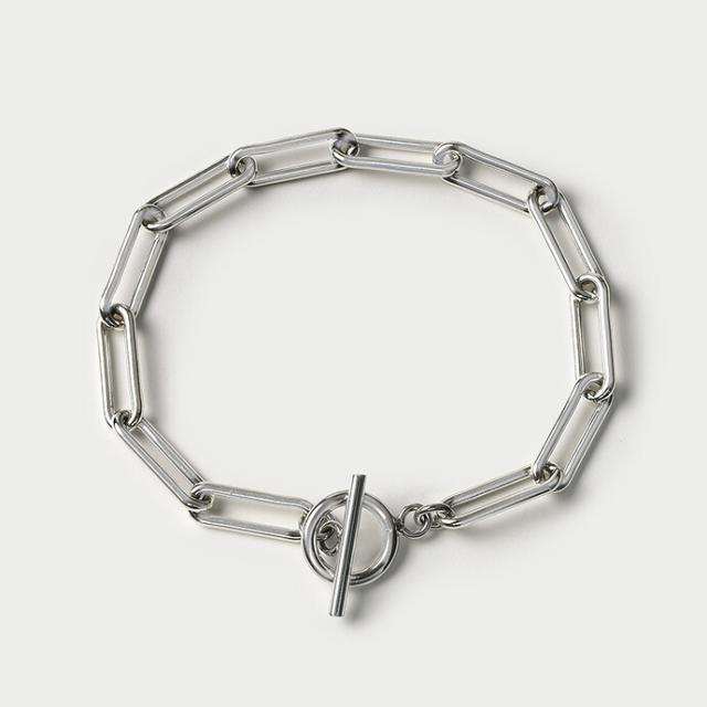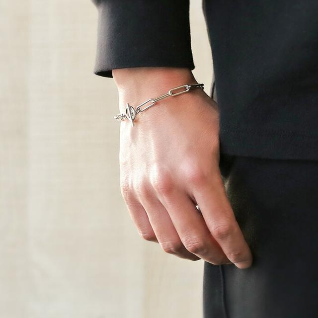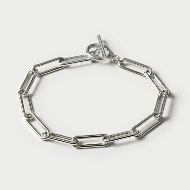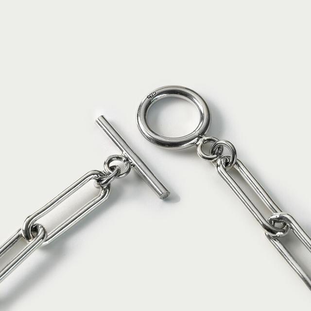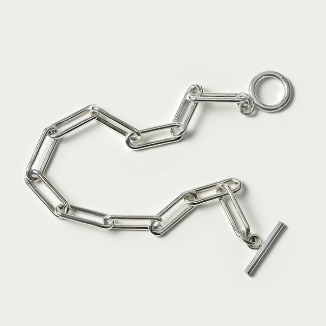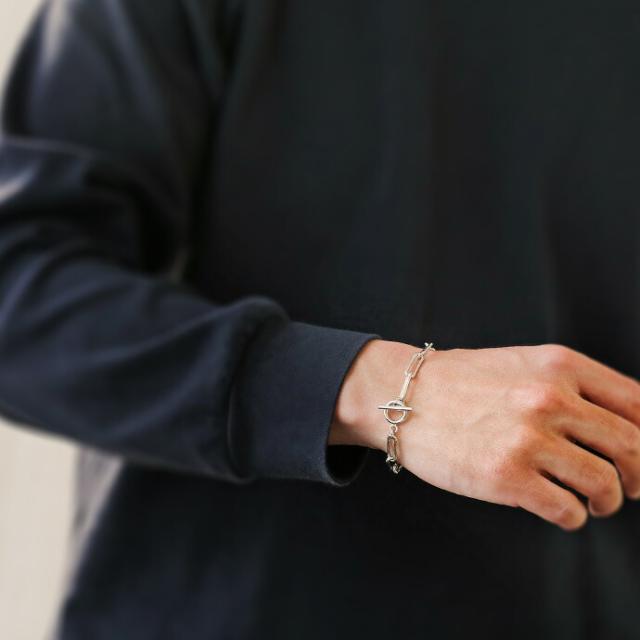 マンテルデザインの留め具がアクセントの長アズキチェーンブレスレット。細いシルバーワイヤーで成形したような長アズキがモードな雰囲気を演出してくれます。留め具も同じくモードな印象のマンテルデザイン。シンプルなデザインで着けやすい幅感のブレスレットです。