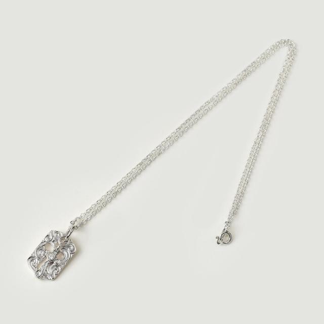 ジルコニアが埋め込まれたクロスと、その形が型抜きされたドッグタグ型プレートが組み合わされたペンダント。絆を象徴するスクロール(波)の彫金が繊細に施されています。ゆらゆらと揺れるクロスの動きに、思わず目を惹かれるアイテムです。