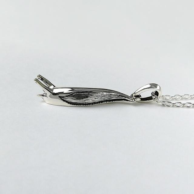 まるで胸元を這っているようにも見える、ナメクジがぶら下がったデザインのペンダントです。ナメクジは日本最古の三すくみとされる虫拳(じゃんけんに似た遊び)では、ヘビに勝つ存在とされるなど意外な一面を持っています。思わず二度見してしまいそうな、ユニークな生き物アクセが好きな方にオススメです。