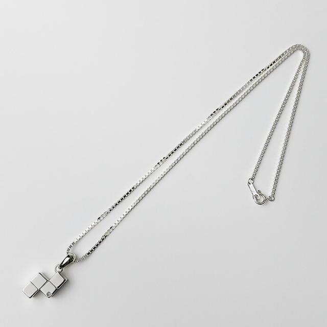 世界的人気がある落ち物パズルゲームのピースを思わせるデザインのペンダント。右下にはダイヤモンドがセットされており、さりげないアクセントになっています。シルバー925のボディは中抜きをしていないため、しっかりとした重みが楽しめます。遊び心と高級感を両立したデザインで、大切な方へのギフトにおすすめしたいアイテムです。
