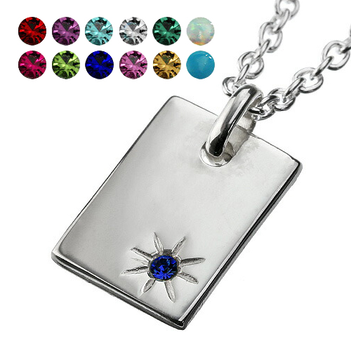 誕生石をイメージしたジルコニアを埋め込んだ小振りなプレートペンダントです。シンプルなデザインはどんなファッションにも合わせやすく、胸元でキラリと光るアクセに最適!程よく小振りで男女共に使えるのでペアにはもちろん、好きなカラーで選ぶのもGOOD!プレゼントにも最適です。