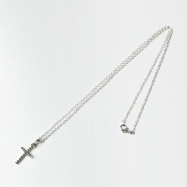 シルバーの紐をねじって成形したようなデザインのクロスペンダント。男性女性共に着けられるシンプルなデザインかつ小ぶりなサイズ感です。十字架モチーフながらゴシックすぎず気軽に着けられるアイテムです。
