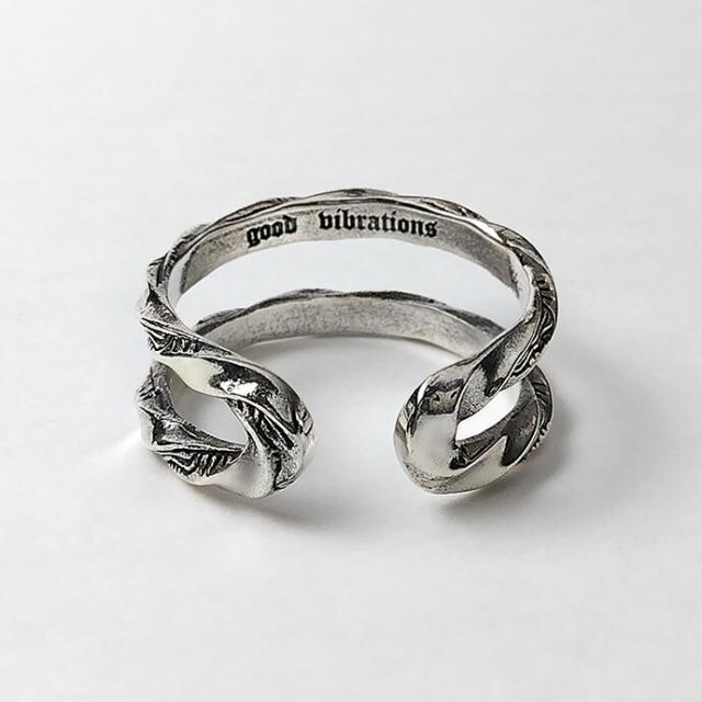 全体をねじったようなボディの随所にネイティブ柄が彫刻されたリング。着用するとまるで細めのリングを2つ着けたように見えるレイヤード(重ね付け風)デザインです。模様を全体ではなくアクセントとして部分的に入れている所が、主張しすぎず使いやすいポイント。1つでもインパクトは十分、他のアクセサリーとの組み合わせもしやすそうなアイテムです。
