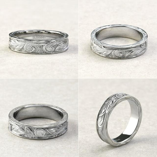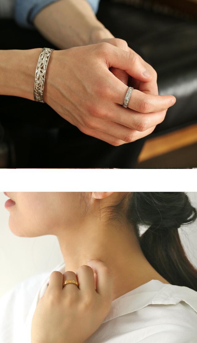 細やかで美しい装飾が魅力のハワイアンテイストのリングです。絆を象徴するスクロール(波)とマイレという葉が組み合わさったデザインになっています。また素材には、ステンレススチールを採用。ノンアレルギー素材でアレルギー体質の方もお手軽にハワイアン気分が楽しめます。