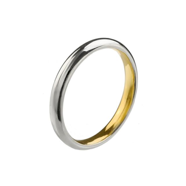 なめらかなラインが魅力の甲丸リングの内側に、ゴールドコーティングを施したリング。表側もプラチナ等によく用いられる仕法・ロジウムコーティングを施しており、高級感のある美しい輝きが楽しめます。限りなくシンプルながら、大人らしい高級感と遊び心を感じさせるリングです。