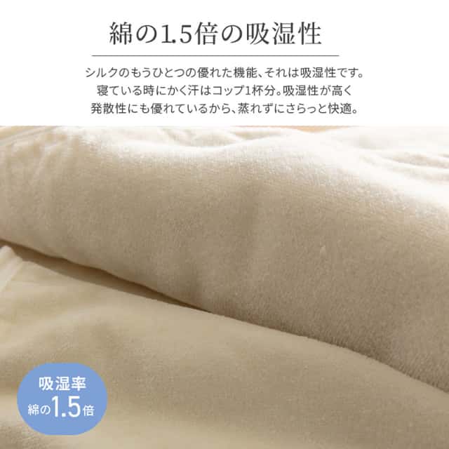 - 綿の1.5倍の吸湿率がシルクの特長です。
