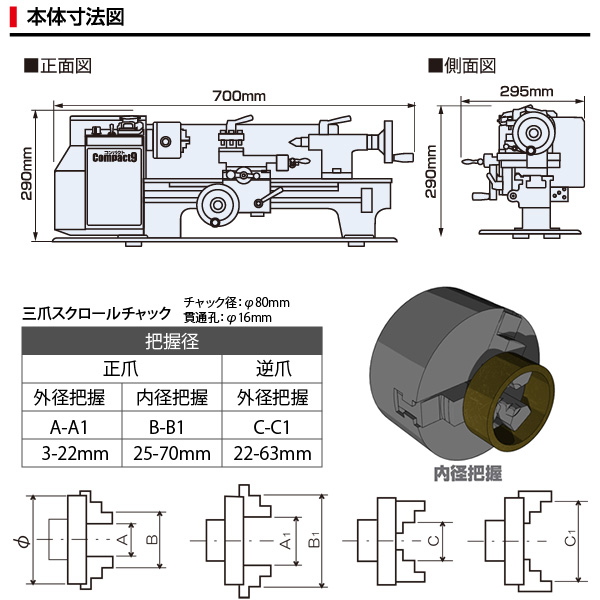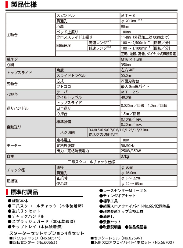 - チップトレイ、スプラッシュガード、三爪スクロールチャック、レースセンター、チェンジギアセット標準装備。