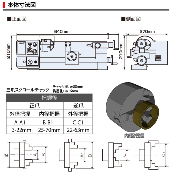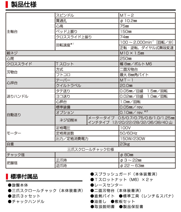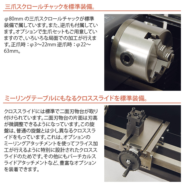 - 三爪スクロールチャック、レースセンター、スプラッシュガード、刃物台、直剣バイト標準付属。