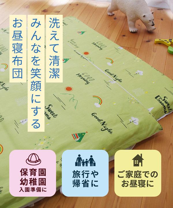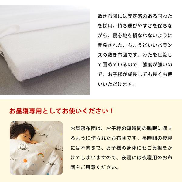 | 素材 | ・お昼寝掛け布団 側生地:ポリエステル100%、 中わた:ポリエステル100% ・お昼寝敷き布団 側生地:ポリエステル100%、 中わた:ポリエステル100% ・掛け布団カバー 生地:綿100% ヒモ止め式 ・敷き布団カバー 生地:綿100% ヒモ止め式 ・専用バッグ 生地:綿100% |