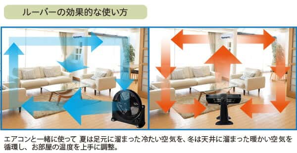 - 風向きルーバーが回転するから部屋の空気をムラなく循環。