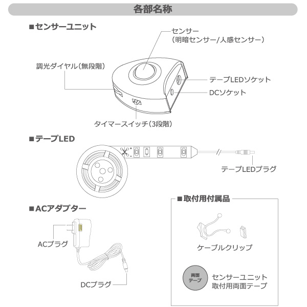 | 付属品 | テープLED・センサーユニット・ACアダプター・ケーブルクリップ・両面テープ |