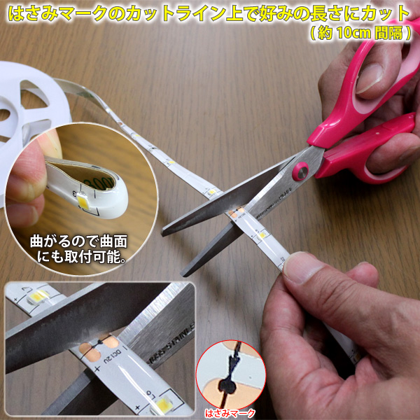 約10cm間隔のはさみマークの位置ならどこでもカットOK!こんなに柔らかいから曲面への取り付けもOK!
