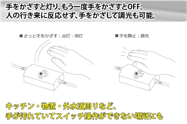 センサーの前で手を静止させると調光可能。すべての操作はスイッチに触れる必要がありません。