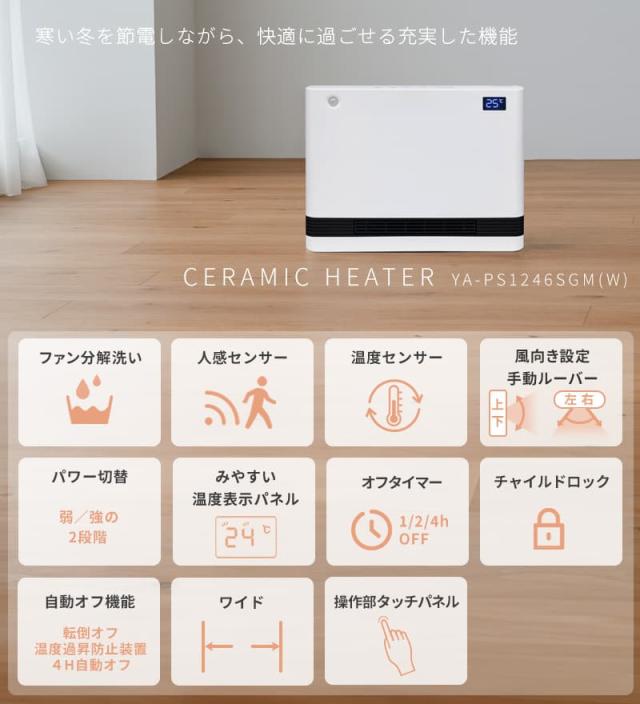 ユアサプライムス セラミックヒーター 人感センサー付き 温度センサー付き YA-PS1246SGM 電気ファンヒーター チャイルドロック ルーバー付き ファンが洗える 分解清掃 1200W/600W 強弱2段階切替え 温風 自動オフタイマー YUASA