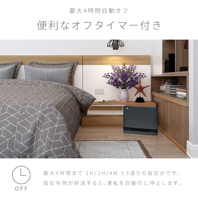 1時間/2時間/4時間の設定が可能です。お部屋の暖めすぎや消し忘れを防止。