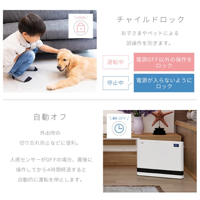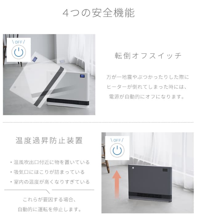 転倒時自動オフスイッチ/温度過昇防止装置/チャイルドロック/消し忘れ自動オフ