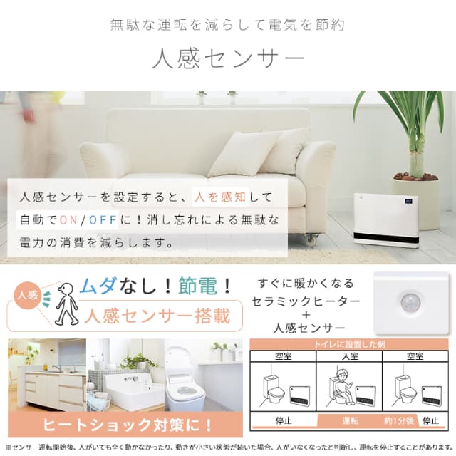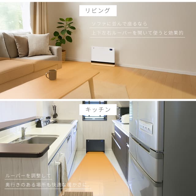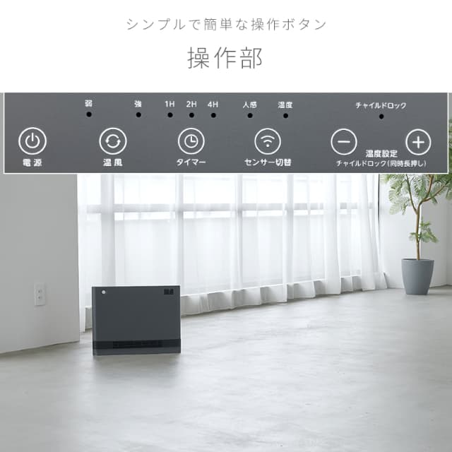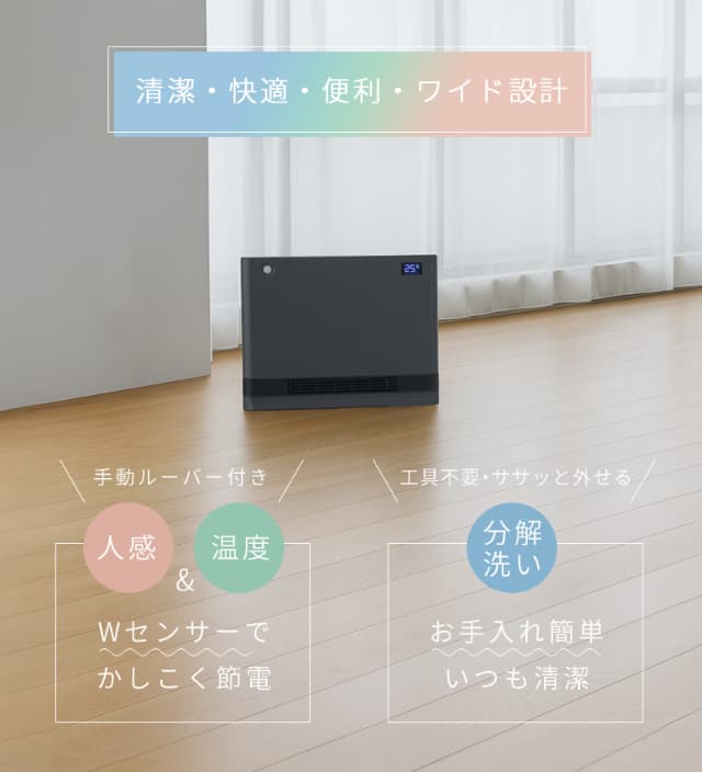 | 機能 | 人感センサー/温度設定(温度センサー搭載)/出力2段階切換え/チャイルドロック/1、2、4時間オフタイマー/切り忘れ防止4時間自動オフタイマー/左右独立手動ルーバー/ファン・フィルター分解水洗い可 |